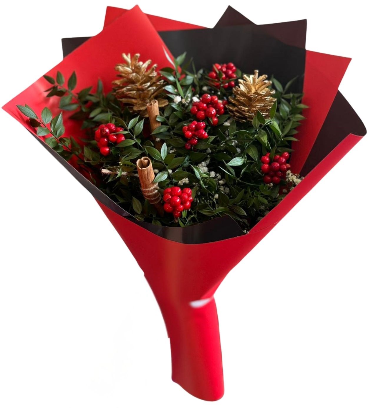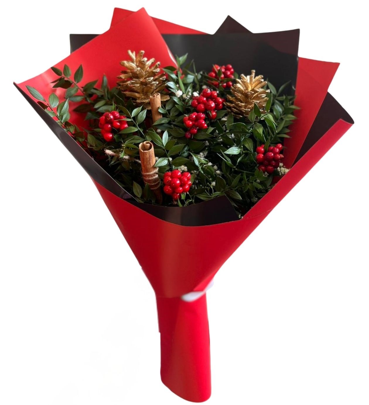 Yeni yıl ruhunu en zarif şekilde yansıtan Kokina Yılbaşı Buketi, kırmızı meyveli kokina dallarının enerjisini; altın çam kozalağı ve tarçın çubuklarının sıcak dokusuyla birleştiriyor. Kırmızı-siyah özel tasarım ambalajı sayesinde hem modern hem de göz alıcı bir yılbaşı konsepti sunar.