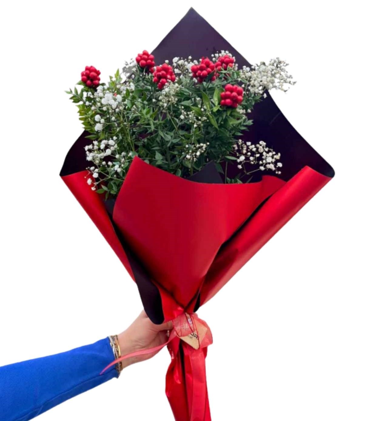 "Yılbaşı Masalı" kokina buketi, geleneksel yılbaşı süslemelerinin modern bir yorumu olarak tasarlandı. Kokinaların canlı kırmızı tonları ve yeşil yaprakları, özel olarak seçilmiş kırmızı kağıt ambalajla bir araya gelerek etkileyici bir görsel şölen oluşturuyor. Yılbaşı ruhunu temsil eden bu sade ve zarif buket, hem sevdiklerinize armağan edilebilecek anlamlı bir hediye hem de yeni yıl sofralarınıza veya yaşam alanınıza sıcacık bir dokunuş katacak bir dekoratif unsur olarak öne çıkıyor.